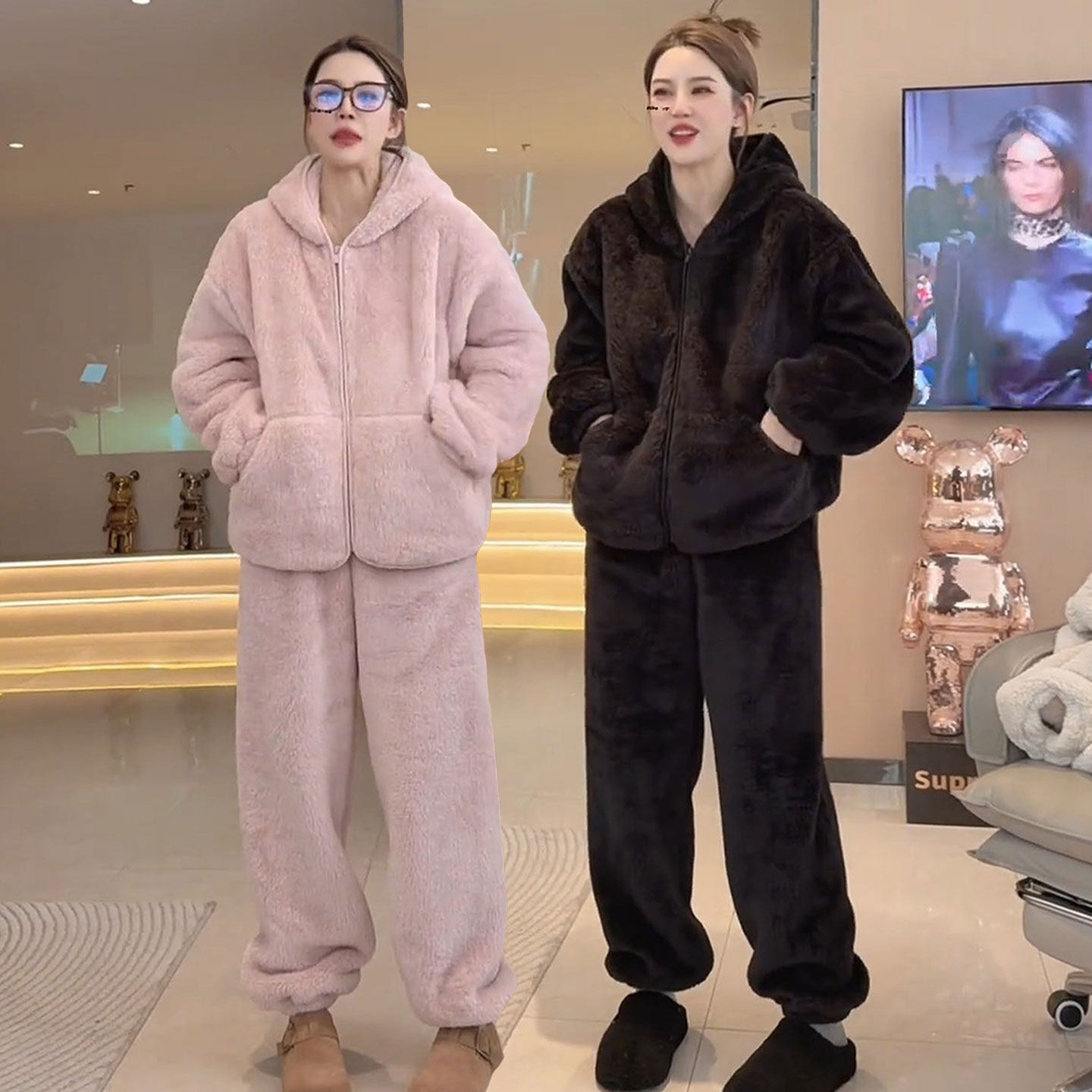 带帽家居服睡衣女加绒加厚冬季2025新款双面珊瑚绒长袖连帽套装厚