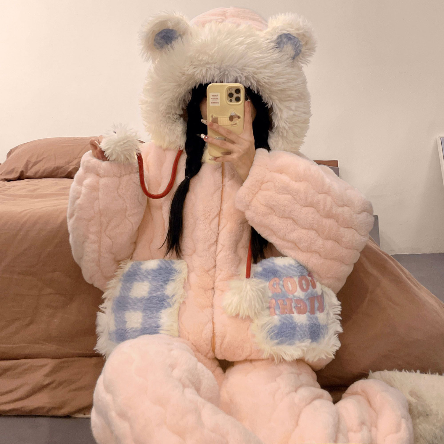 连帽睡衣女冬季家居服25新款双面北极绒加绒加厚带帽长袖套装Q563