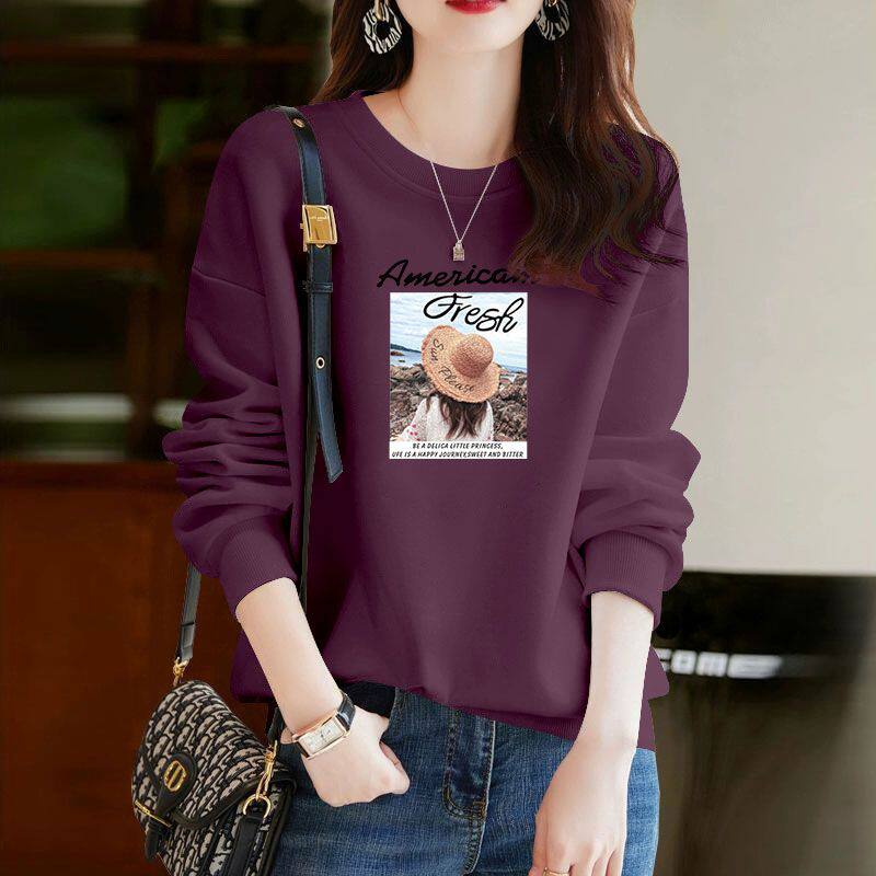 纯棉暗紫色套头休闲卫衣女春秋新款韩版洋气宽松显瘦百搭圆领上衣