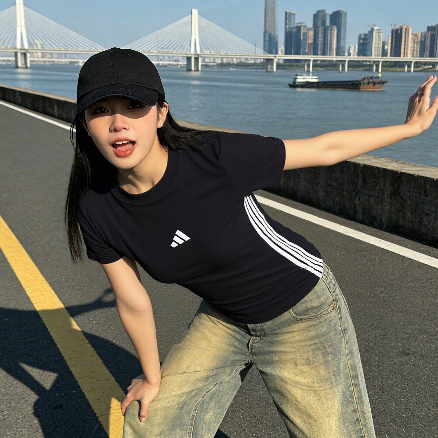 adidas阿迪达斯三叶草修身半截袖2026春女三条纹短袖T恤 KD3684