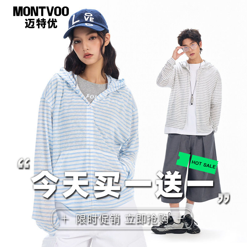 迈特优韩系慵懒风连帽条纹T恤男女春夏新款运动防晒长袖开衫卫衣