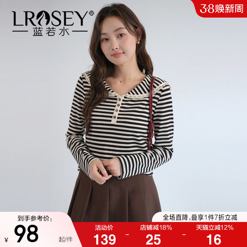 【蕾丝边海军领条纹T恤】蓝若水大码2026春装新款洋气减龄打底衫