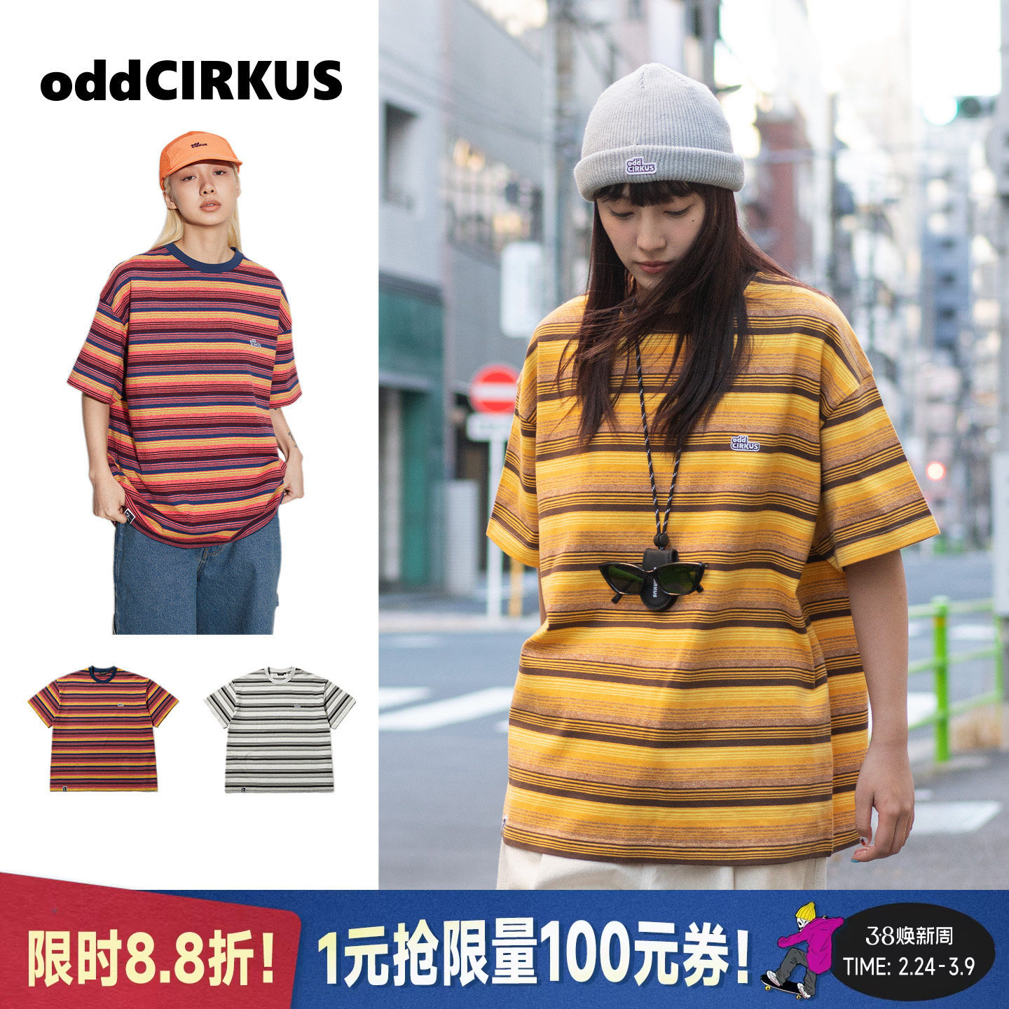 oddCIRKUS条纹T恤 日系街头姜黄色条纹短袖圆领T恤男女同款新款