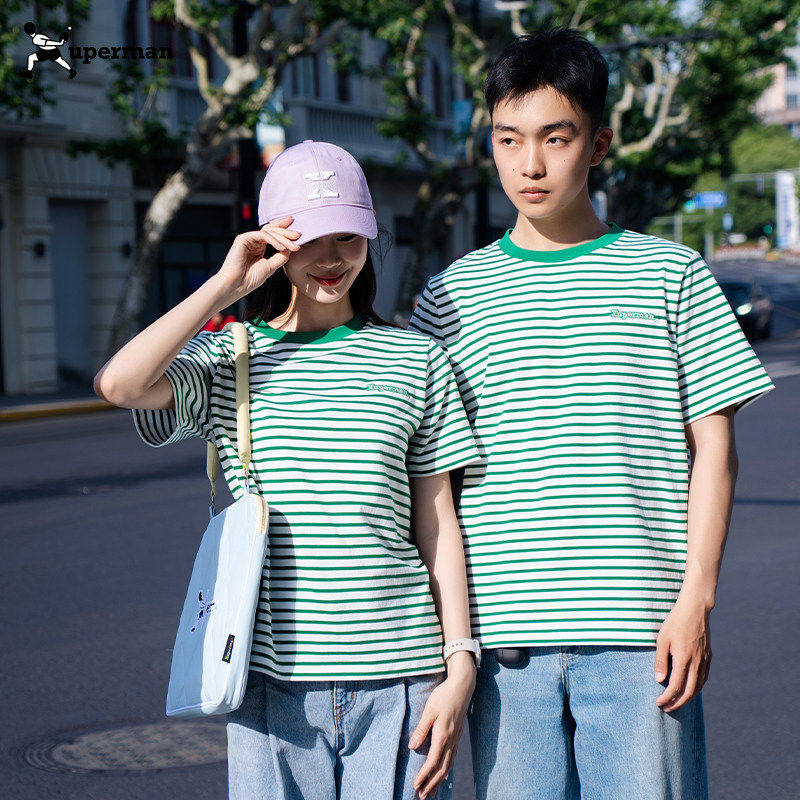 Xuperman圆领撞色复古条纹T恤夏季新款纯棉舒适休闲短袖上衣