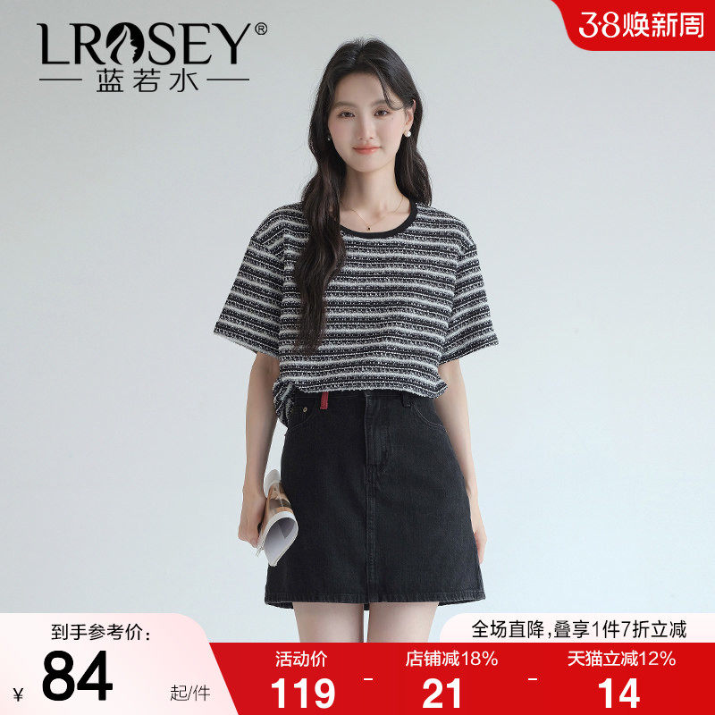 【小香风黑白亮丝条纹T恤】蓝若水大码2026夏装新款复古短袖上衣