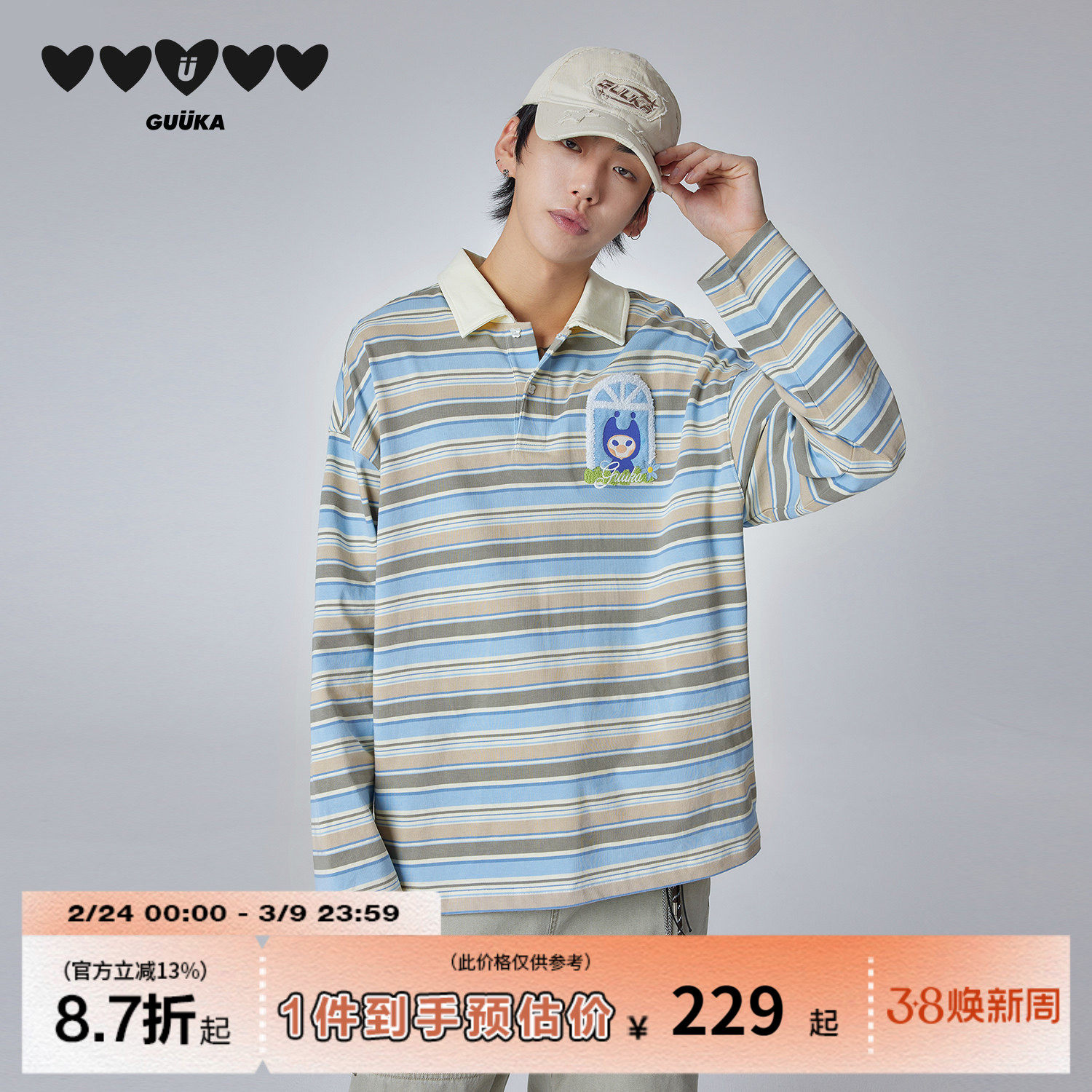 GUUKA潮牌条纹t恤男长袖polo衫春季情侣蝴蝶纽扣落肩刺绣上衣宽松