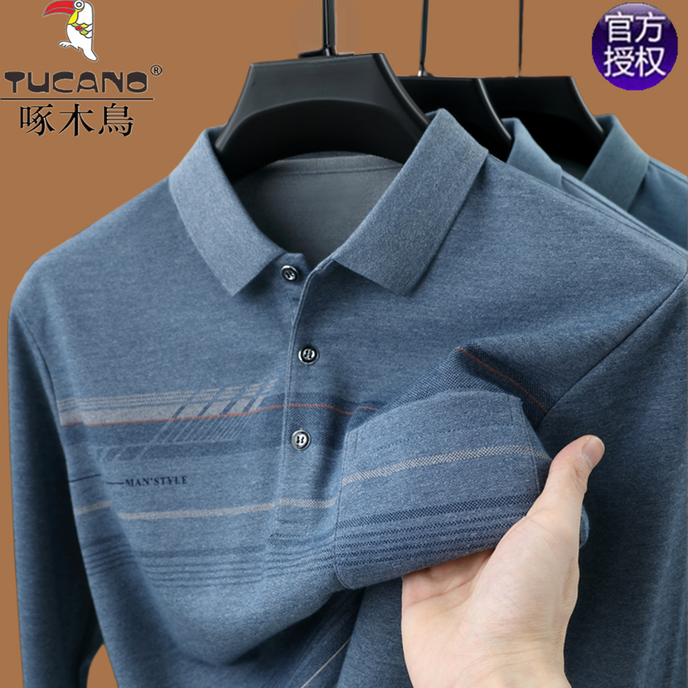 啄木鸟男士条纹t恤长袖春秋季宽松翻领棉质中老年爸爸打底polo衫