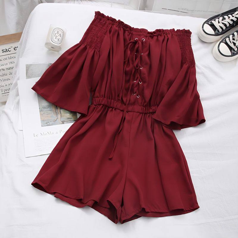 一字领荷叶边连体裤女阔腿露斜肩裹胸抹胸体连体短裤薄款高腰显瘦