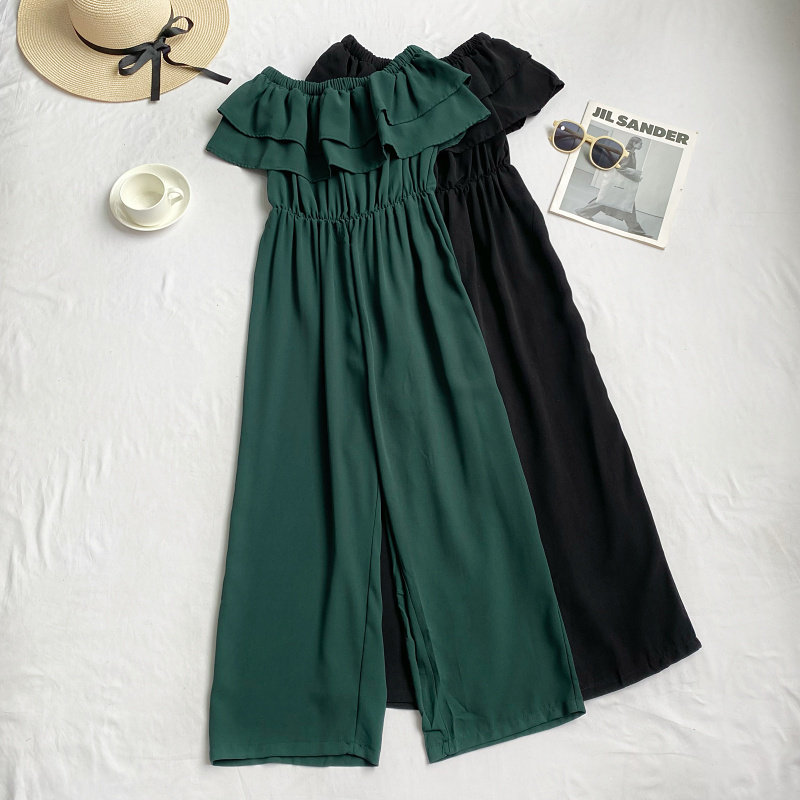 夏季新款欧美风一字领荷叶边短袖松紧收腰阔腿连体裤长裤Jumpsuit