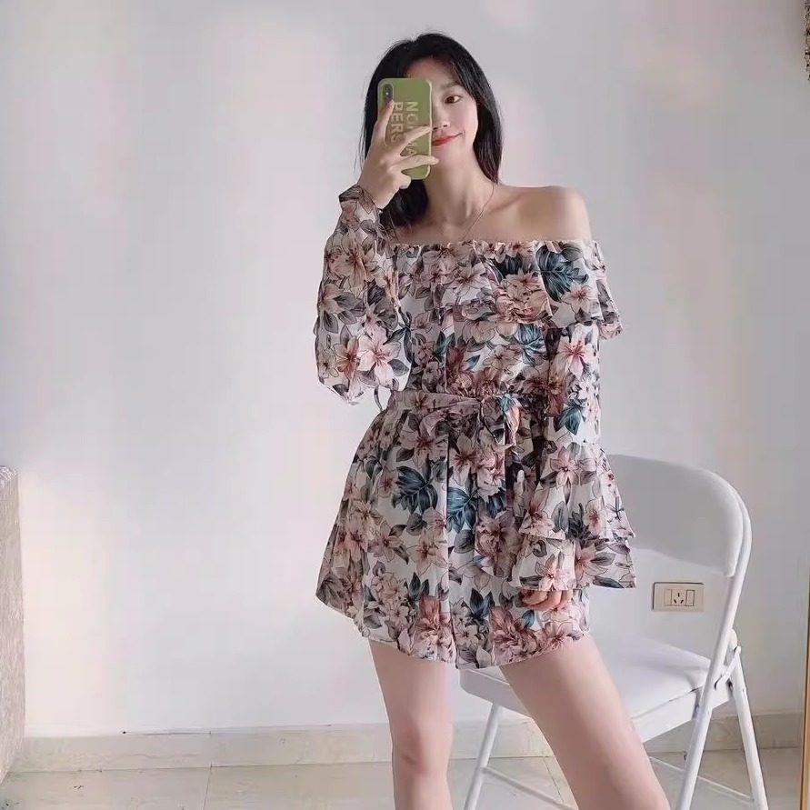 韩国chic夏季复古气质一字领露肩收腰显瘦短袖碎花连体裤阔腿短裤