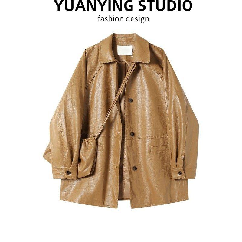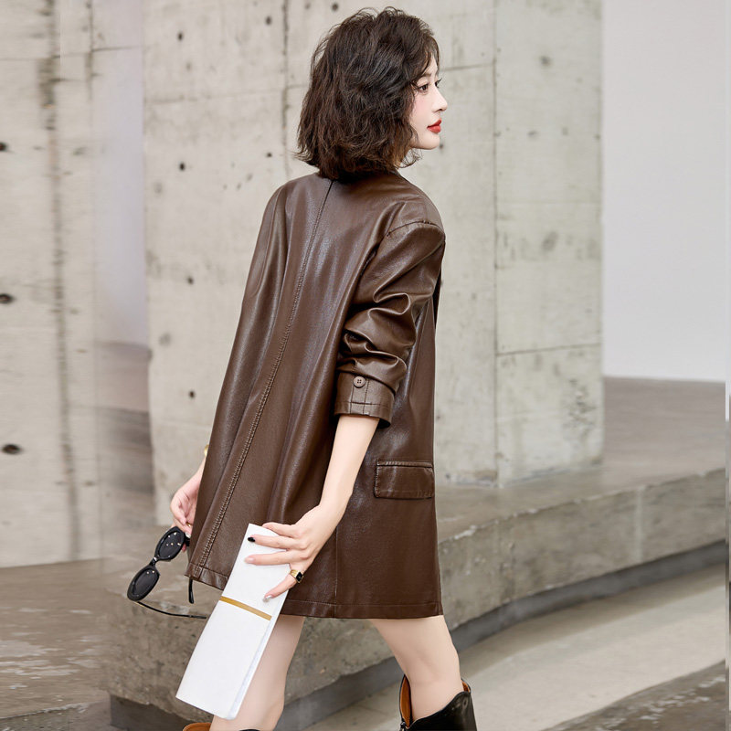 中长款皮衣女时尚宽松2025春秋季新款气质显瘦西装领韩版皮风衣潮