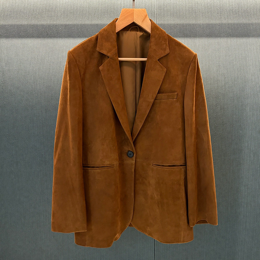 KAKA 伦敦秀场款定制羊皮反绒平驳领丝感内衬社交英伦西装皮衣女