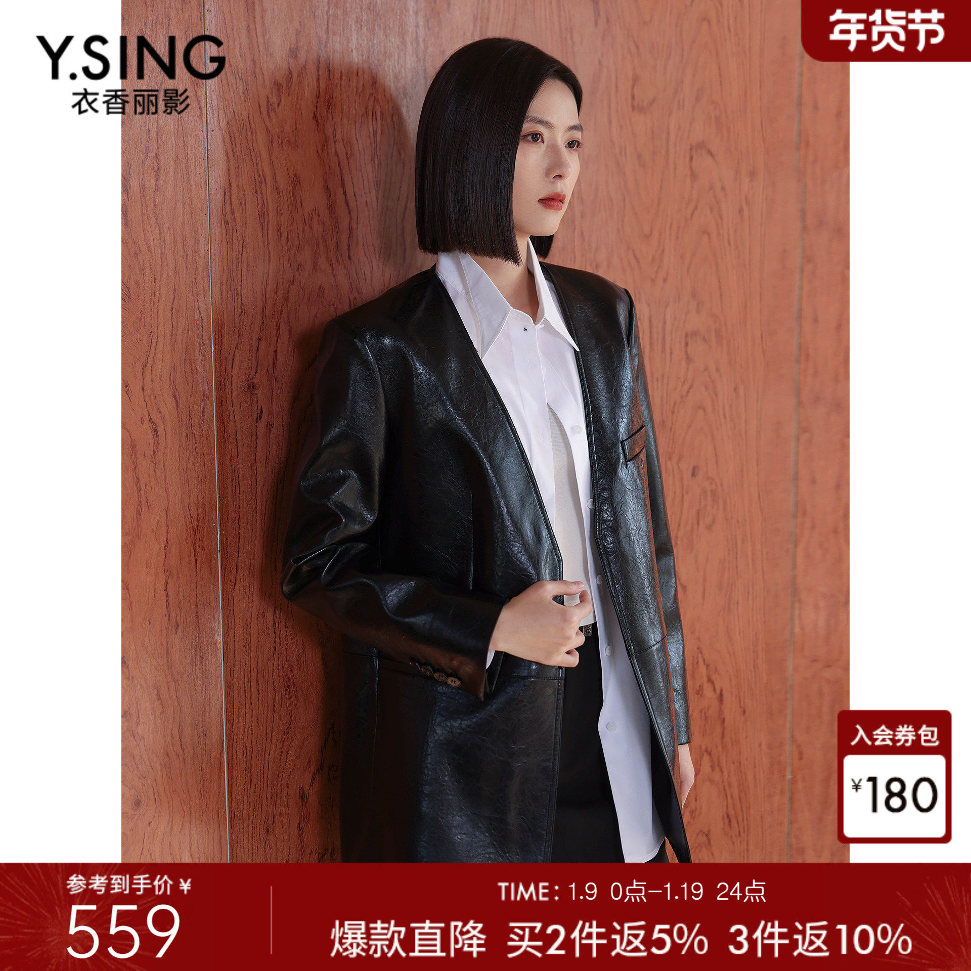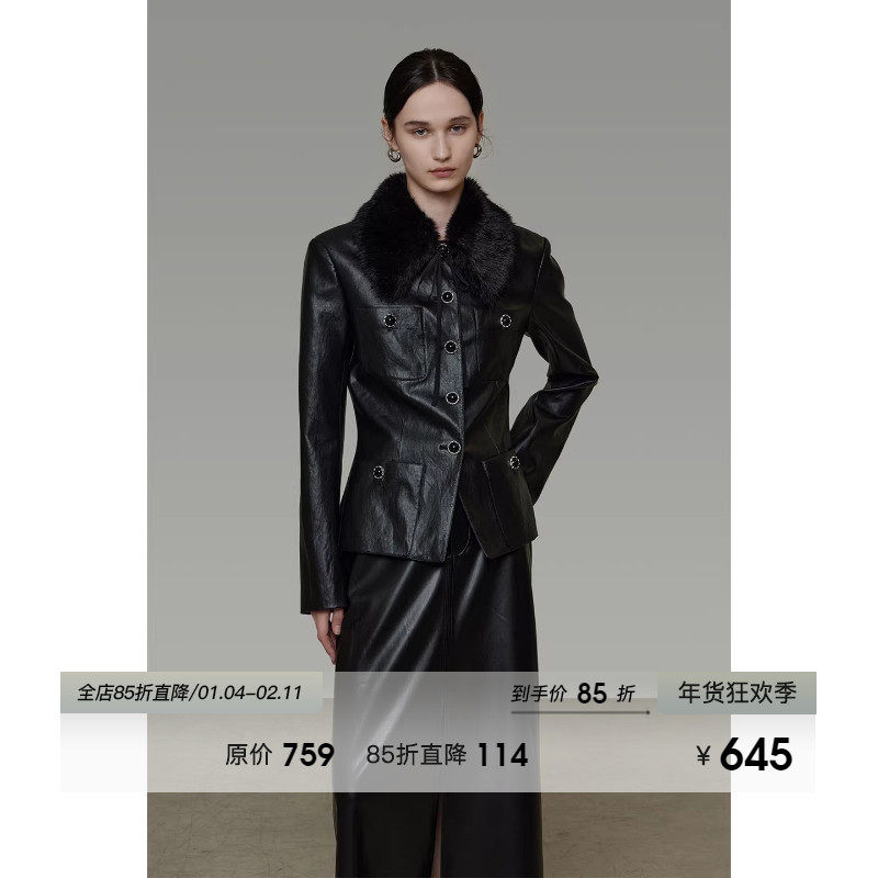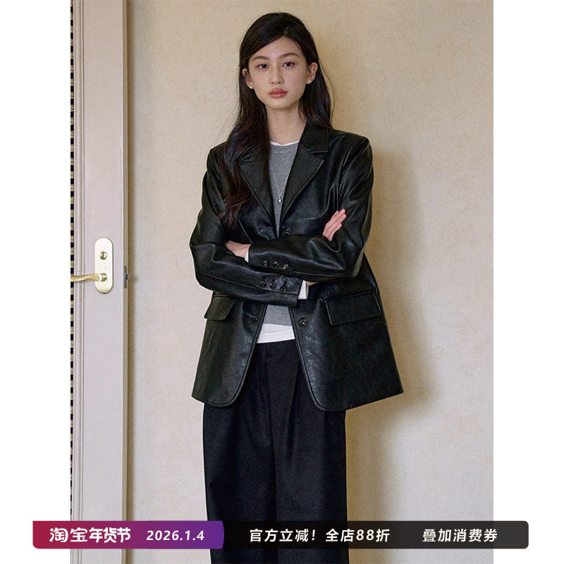 Jicouture “Classic fit”黑色西装皮衣女秋季新款复古PU皮外套