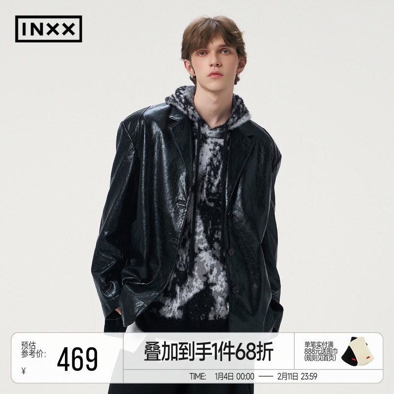 INXX微皱肌理质感PU皮夹克外套男复古廓形黑色西装皮衣女潮牌