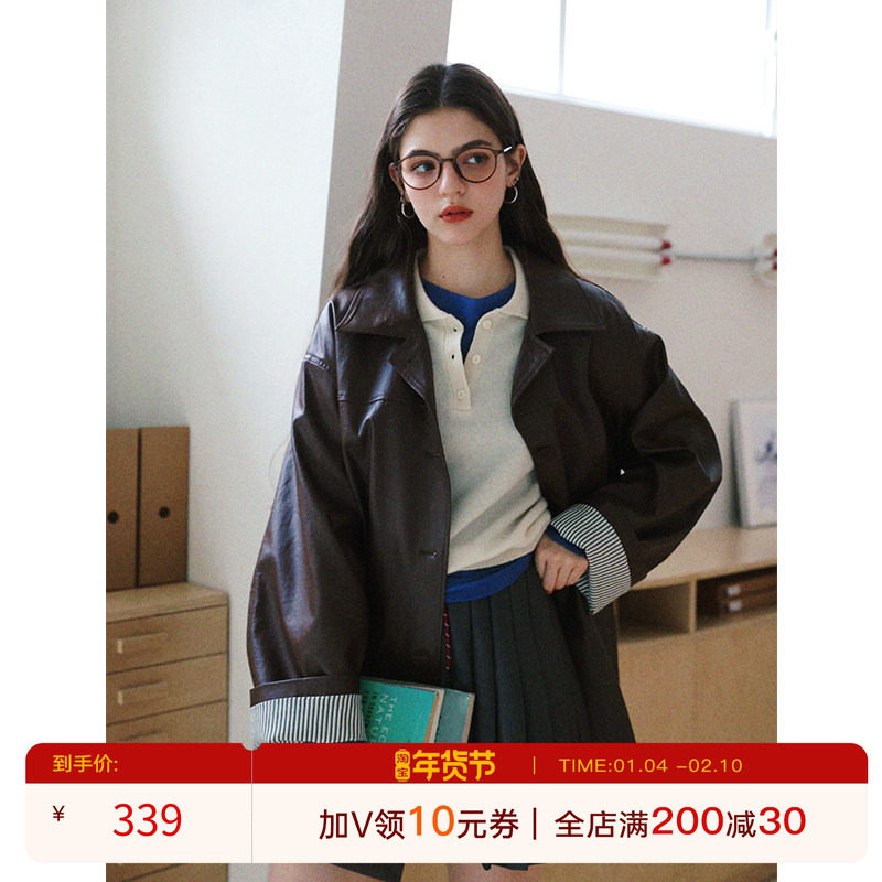 pusumede【现货7折】 黑色复古PU皮衣女2025春季新款宽松西装外套