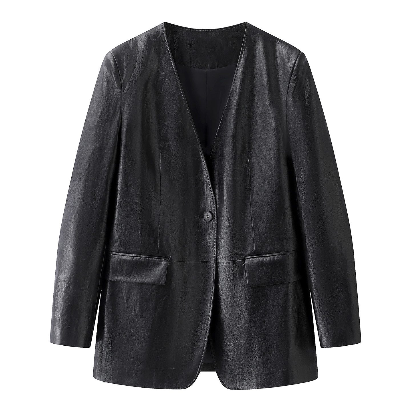 艾 休闲风黑色V领西装皮衣女2026春季新款百搭宽松高级感廓形外套