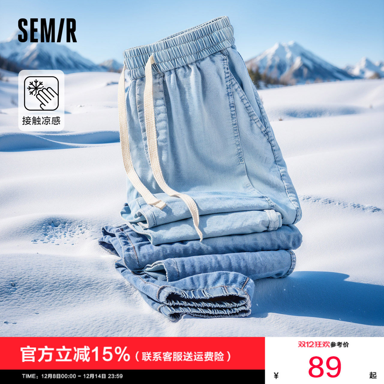 森马牛仔裤男2025夏季新款凉感松紧腰束脚裤男士薄款九分长裤抽绳