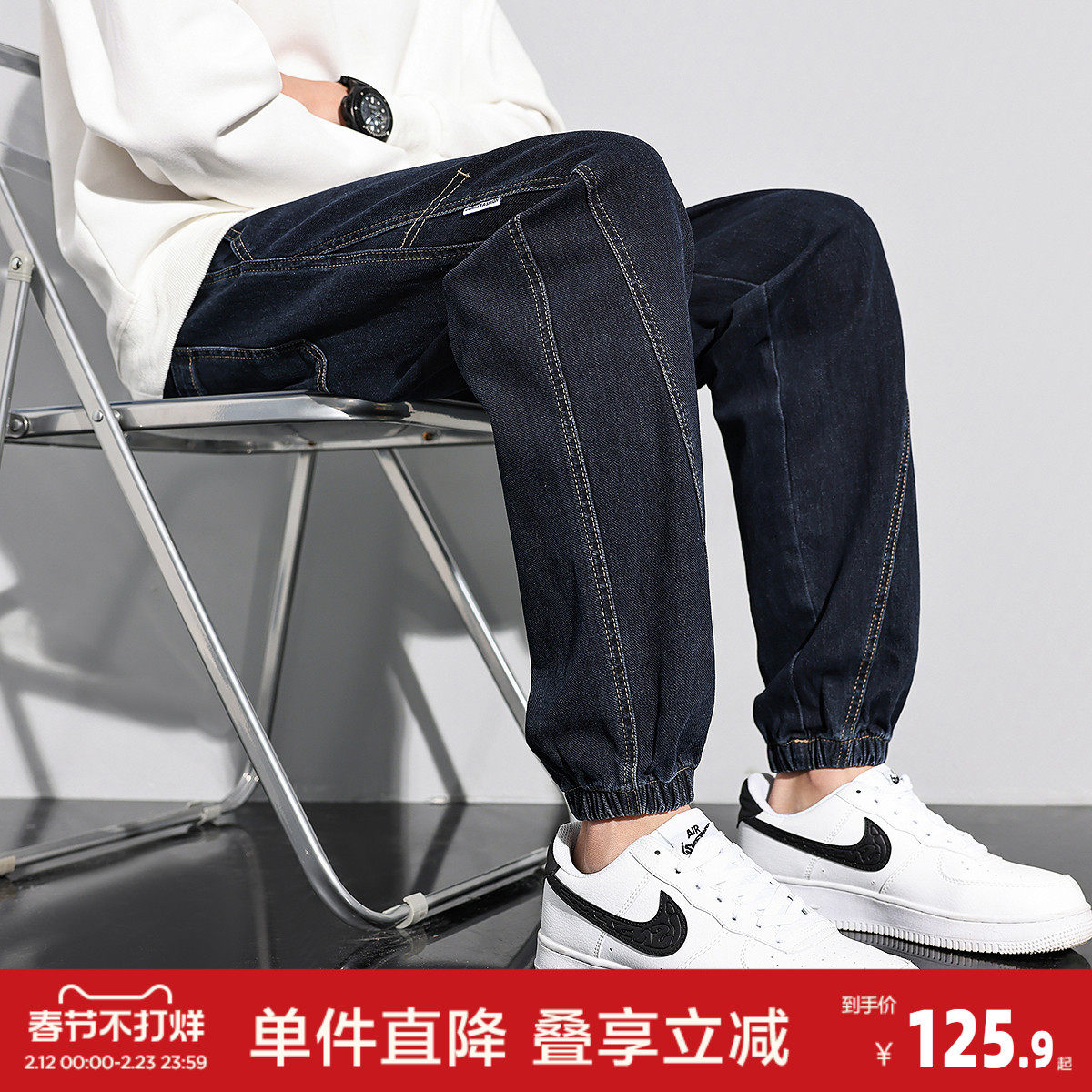 哈伦牛仔裤男士2026春秋新款松紧腰束脚裤潮牌痞帅抽绳休闲长裤子