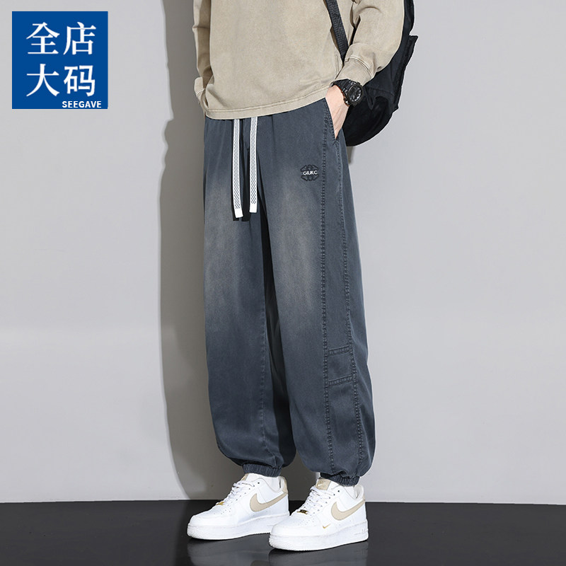 早秋新款牛仔裤男潮牌宽松束脚裤大码胖子粗腿休闲夏款百搭哈伦裤