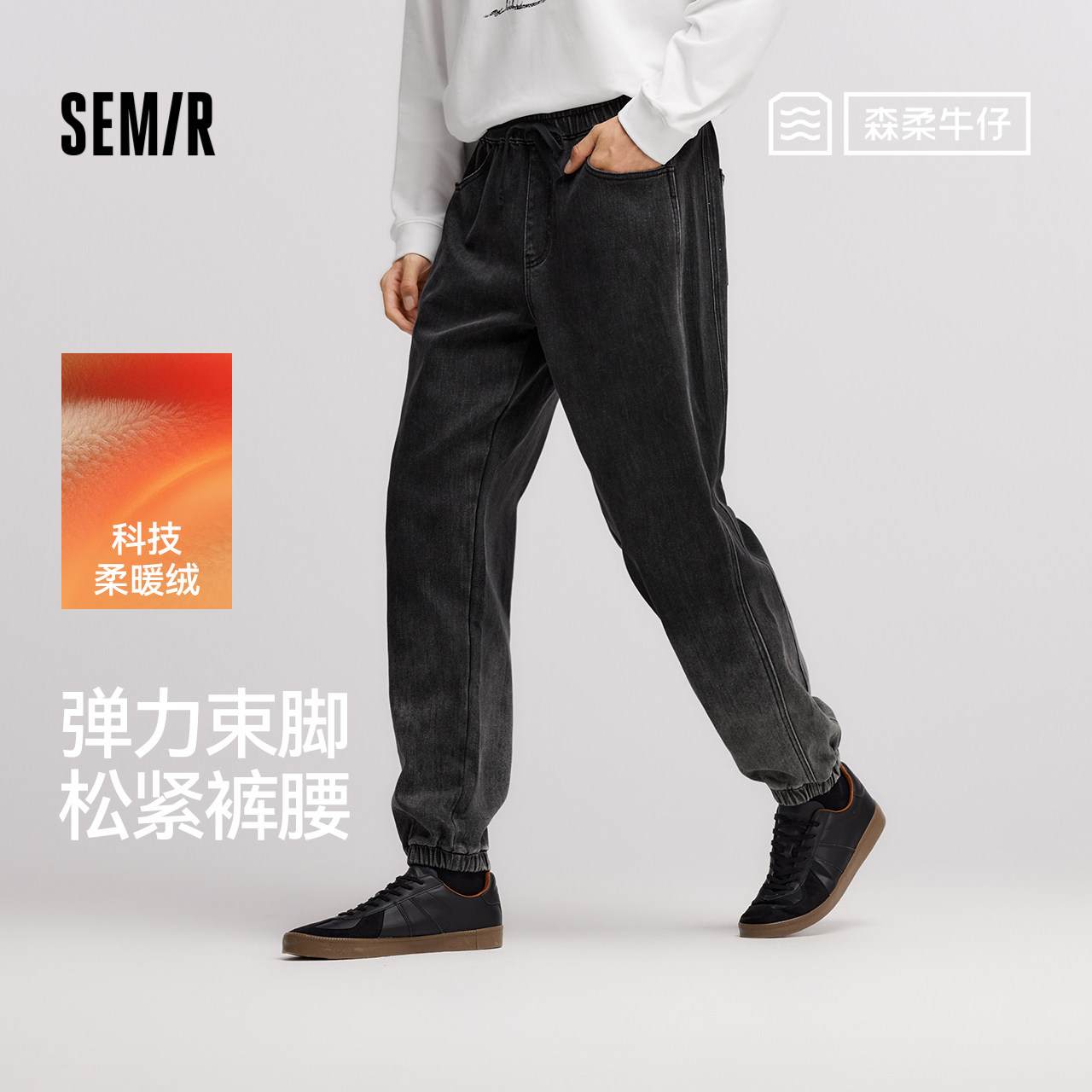 森柔|森马牛仔裤男冬莱卡弹力束脚裤oversize潮流渐变松紧腰裤子