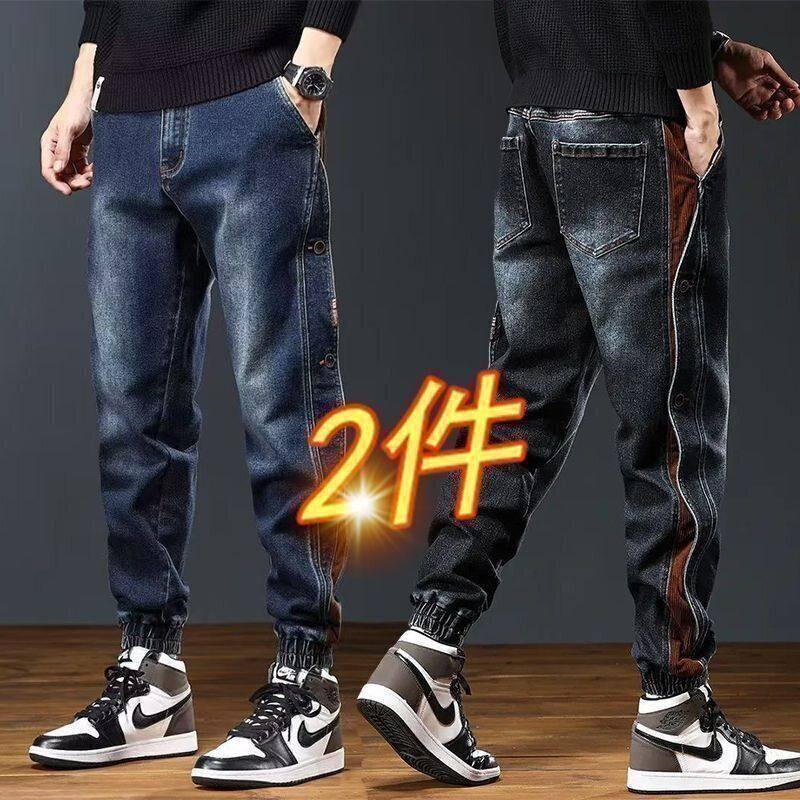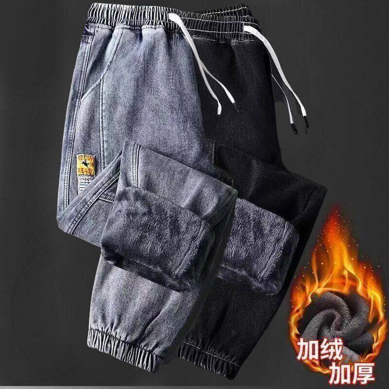 秋冬季加绒加厚款抽绳哈伦牛仔裤男士宽松束脚裤潮流百搭休闲裤子