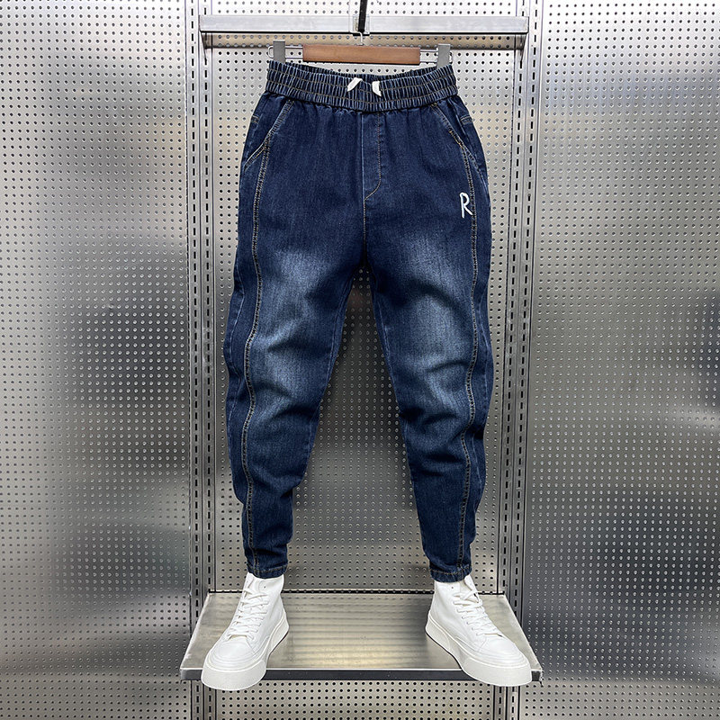 2025男士春秋新款牛仔裤蓝色水洗拼接束脚裤潮流松紧腰小脚哈伦裤