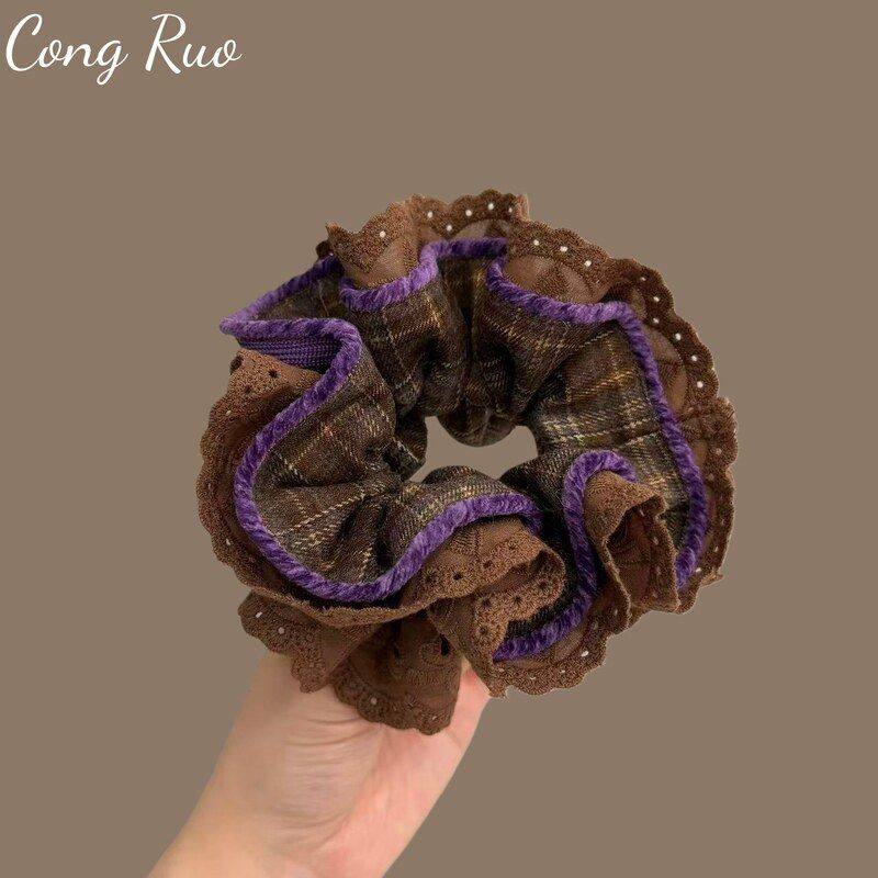 韩风蛮腰发圈原创设计咖色格纹蕾丝复古多层小众发绳丸子头橡皮筋