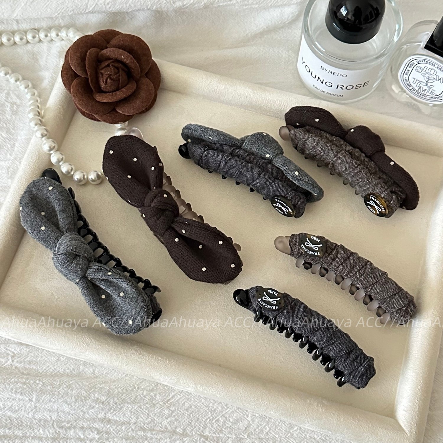 AhuaAhuaya原创手工绕布波点蝴蝶结咖色灰色甜美时尚高马尾香蕉夹