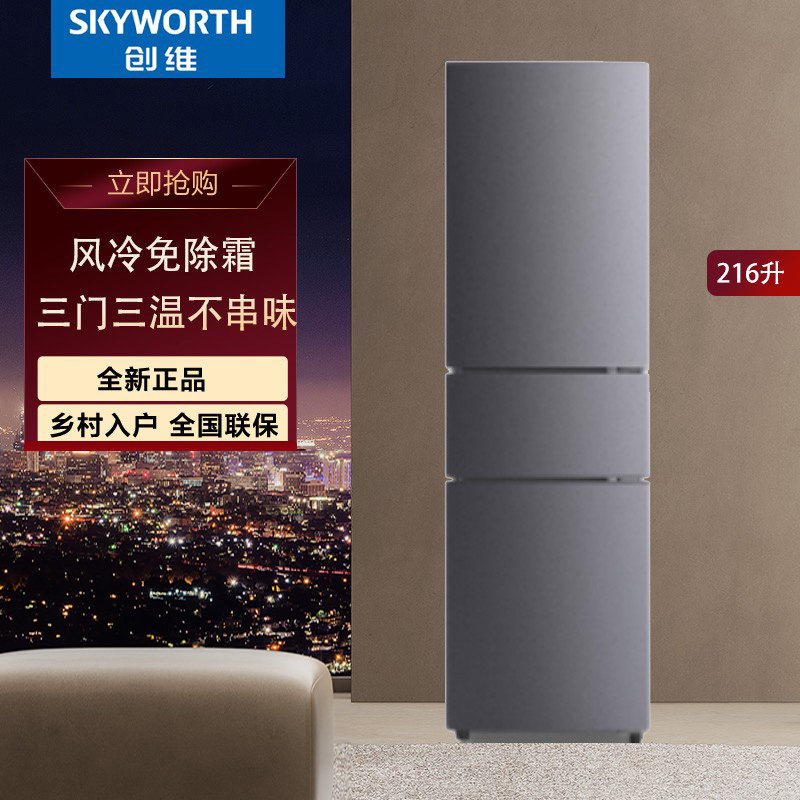 创维216升风冷无霜三开门小型家用宿舍出租房电冰箱冷藏冷冻变温
