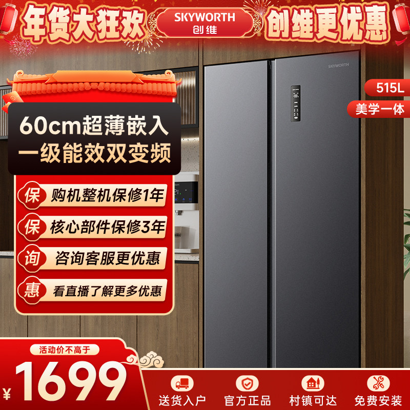 创维十字对开四门冰箱超薄嵌入一级能效双变频风冷无霜净味电冰箱