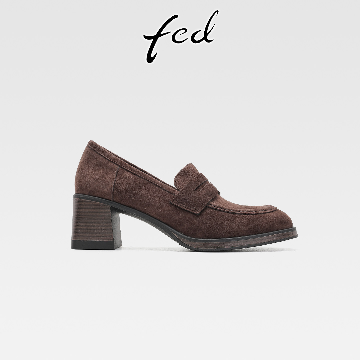 fed复古羊反绒粗跟厚底乐福鞋女一脚蹬气质圆头高跟深口通勤单鞋