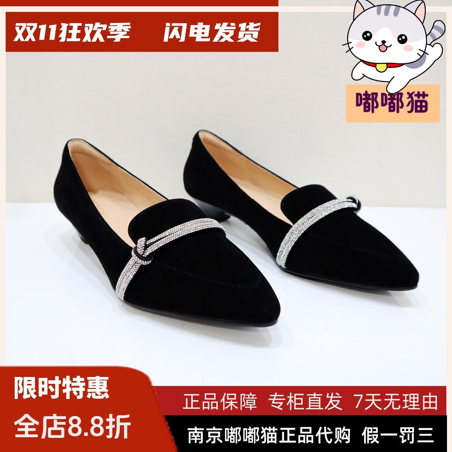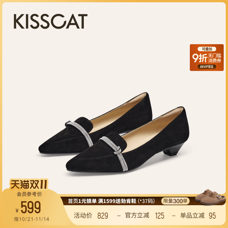 KISSCAT接吻猫[星河]尖头小单鞋25新款真皮绒面黑色深口粗跟单鞋