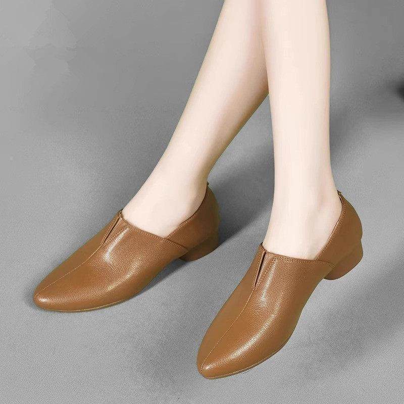 深口粗跟单鞋女2025年春季新款真皮尖头软皮女鞋百搭软底低跟皮鞋