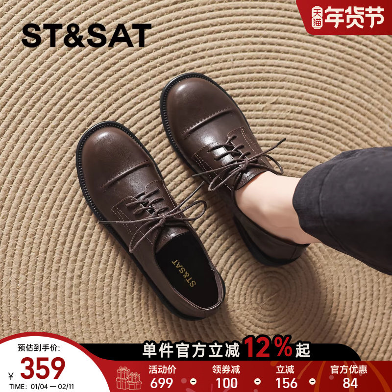 星期六深口粗跟单鞋女冬季2025新款棕色系带小皮鞋英伦风复古女鞋
