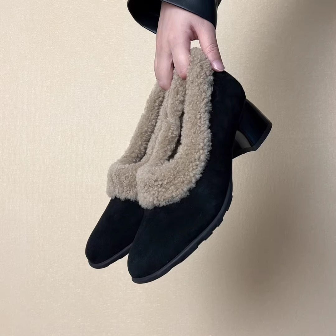 RubyL/4.5cm时尚百搭拼色羊羔毛毛鞋舒适软底圆头深口粗跟单鞋女