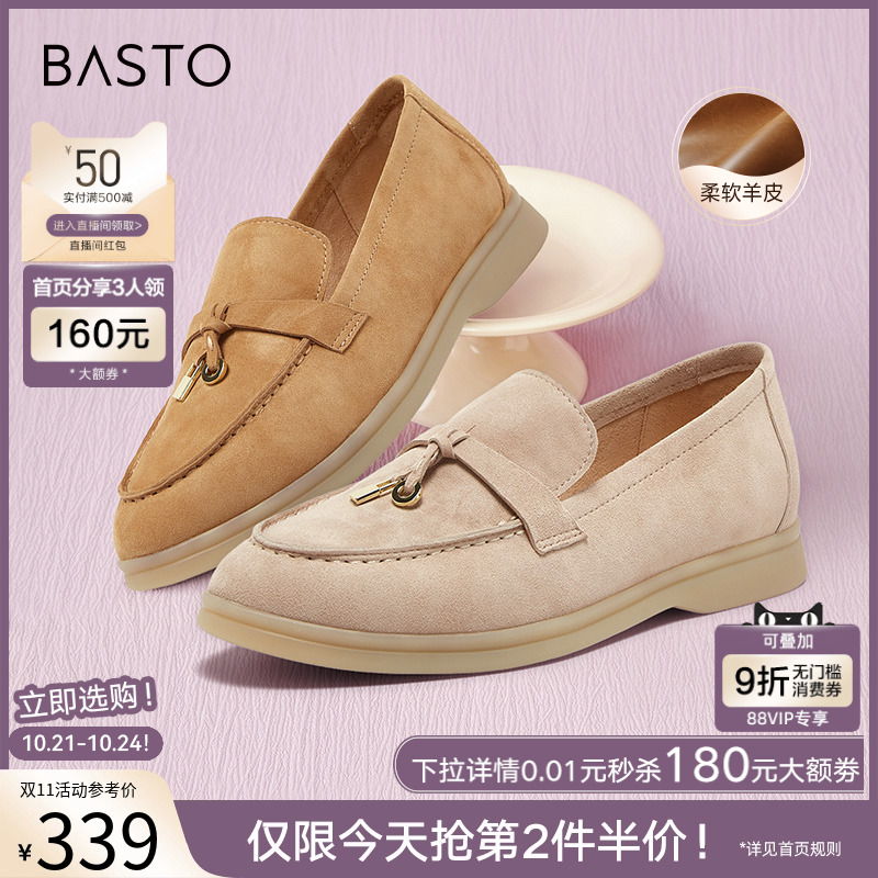 百思图25秋商场新款通勤羊皮乐福鞋一脚蹬粗跟女深口单鞋A4821AA5