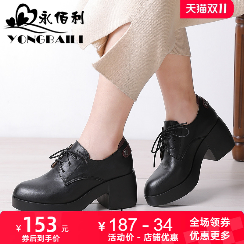 防水台高跟鞋2025春秋新款真皮百搭女鞋欧美系带厚底深口粗跟单鞋