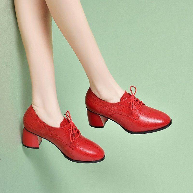 系带深口粗跟单鞋女2025年秋季新款红色妈妈皮鞋中跟软底真皮女鞋