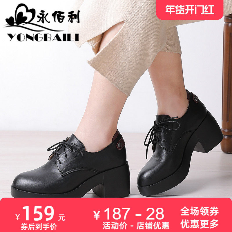 高跟鞋女2025春季新款真皮系带女鞋圆头防水台深口粗跟单鞋皮鞋