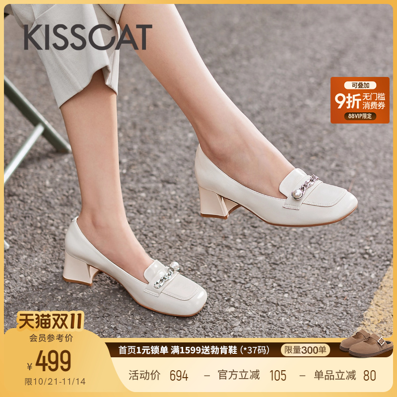 KISSCAT接吻猫新款真皮白色英伦风复古高跟乐福鞋深口粗跟单鞋女