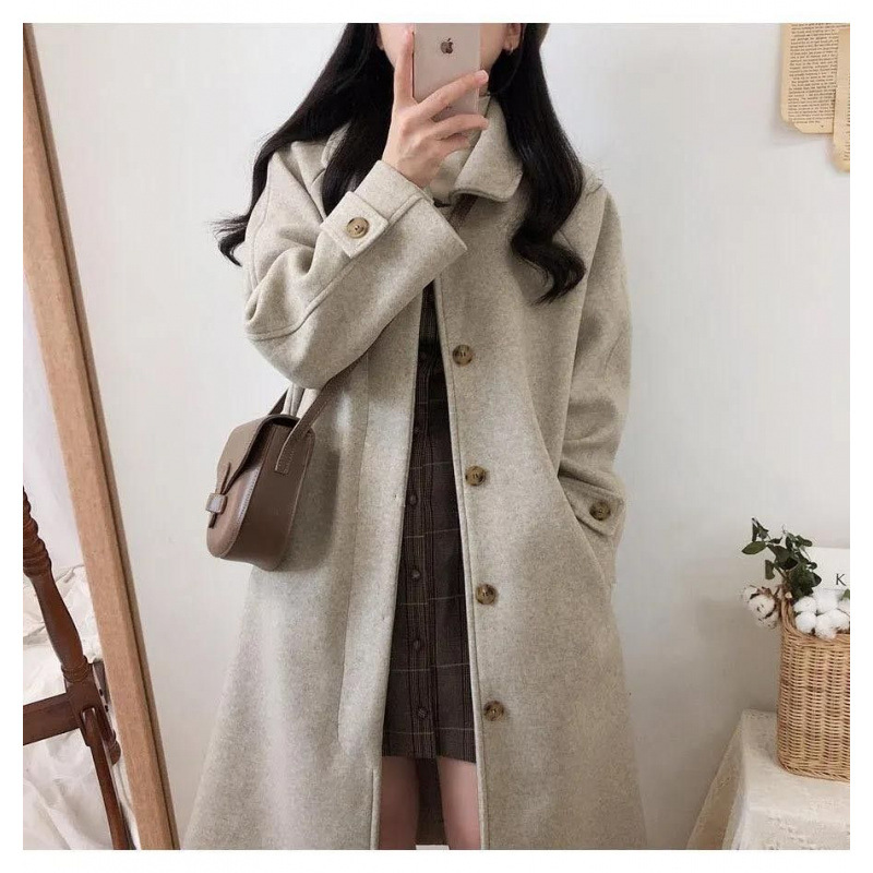 中长款毛呢外套女春冬加棉学生直筒宽松过膝大衣双排扣慵懒风衣厚