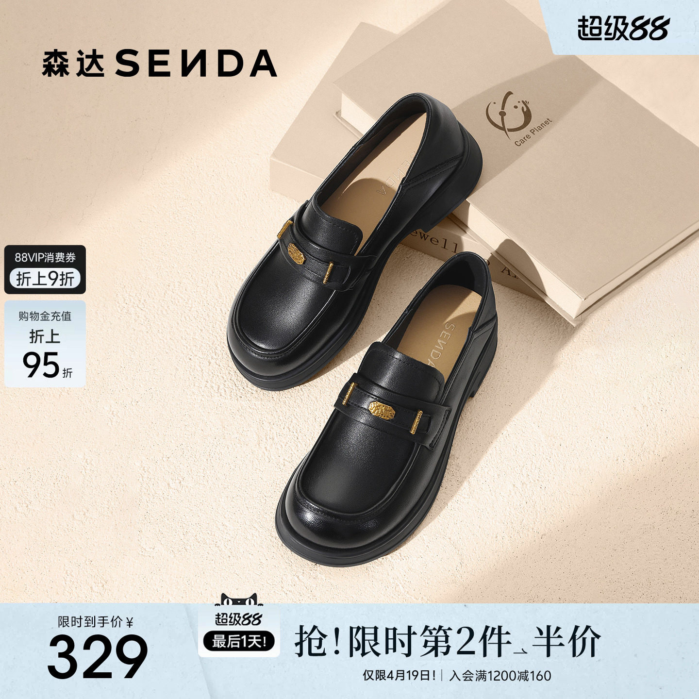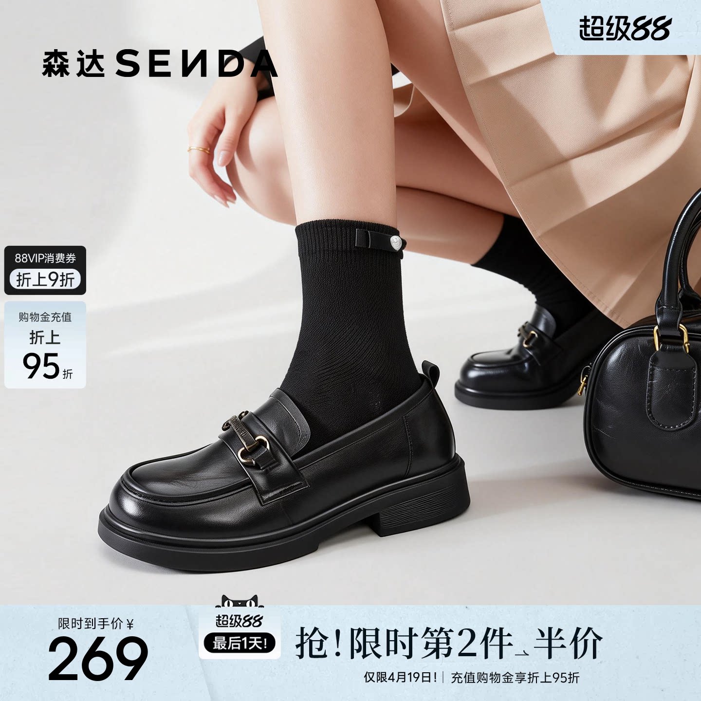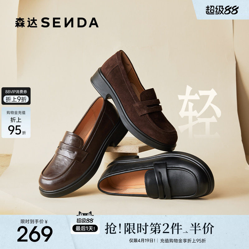 森达真皮新款乐福鞋女商场同款英伦软底皮鞋通勤牛皮黑色厚底女鞋