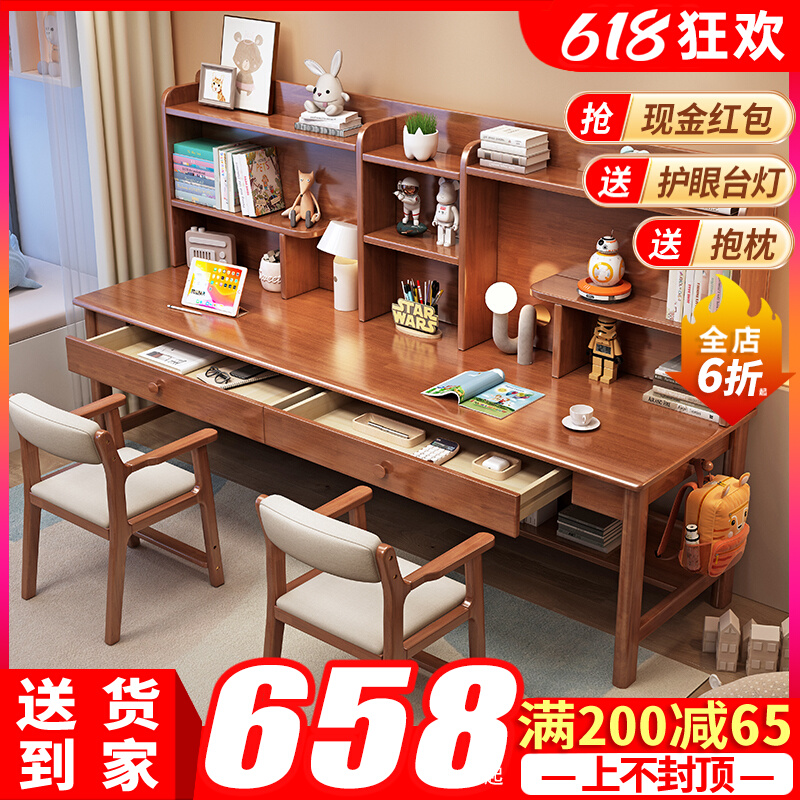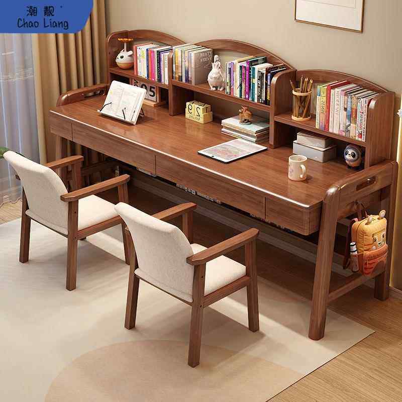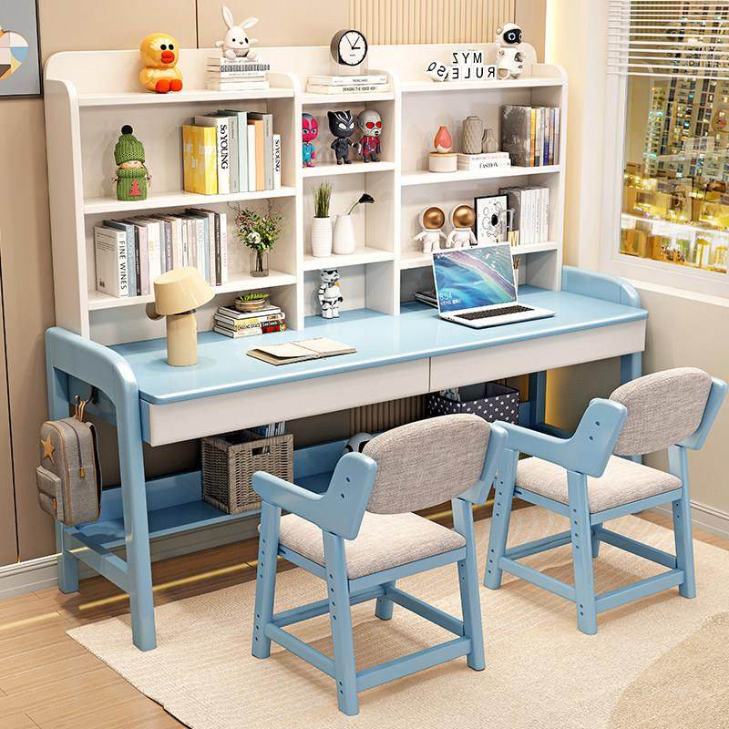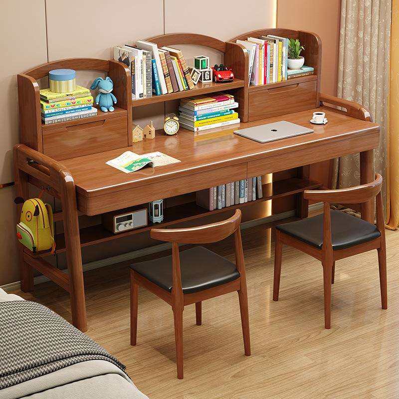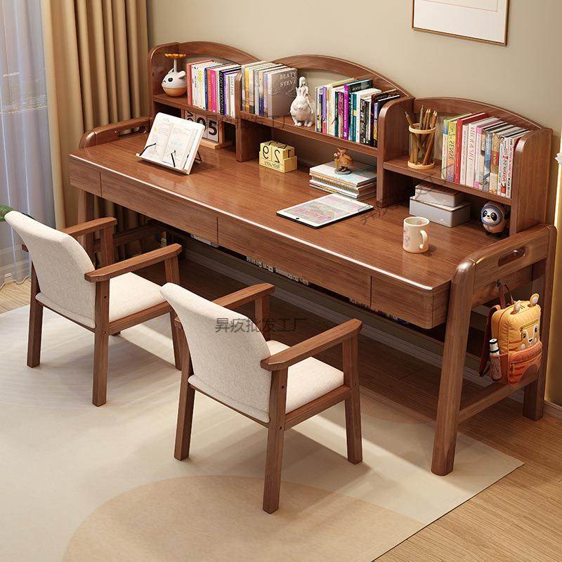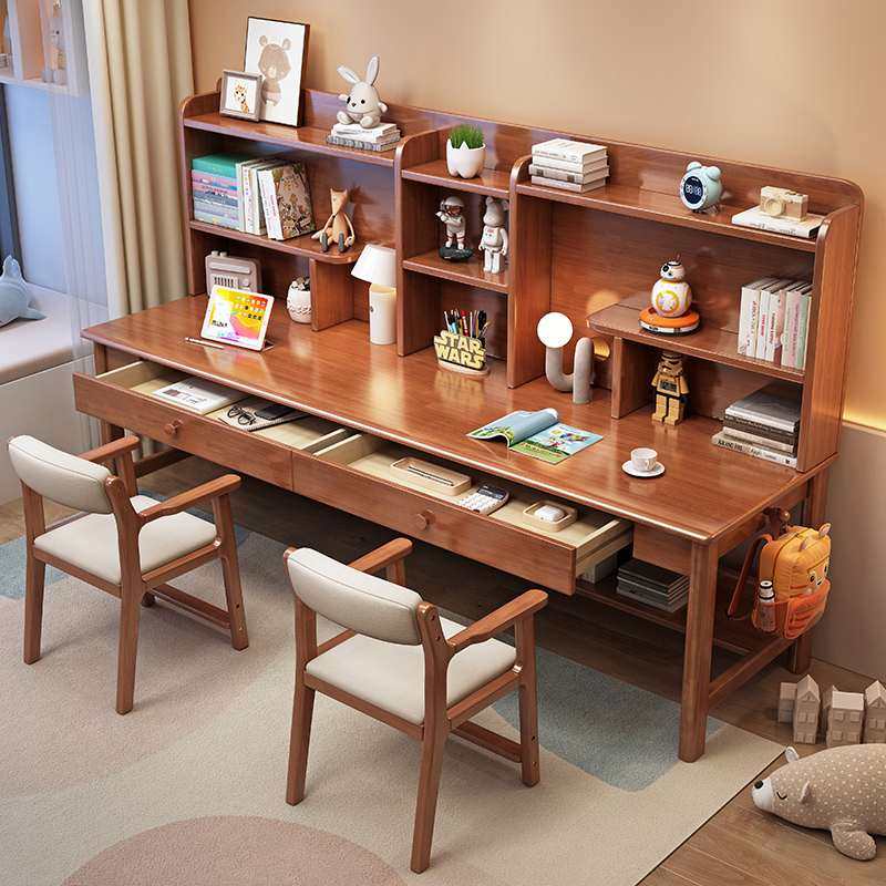 儿童书桌书架组合一体实木双人学习桌家用卧室中小学生写字桌椅子