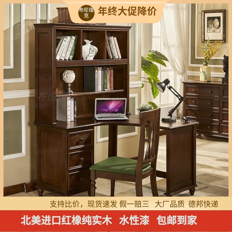美式全实木转角书桌原木儿童书桌书架组合一体拐角小户型环保家具