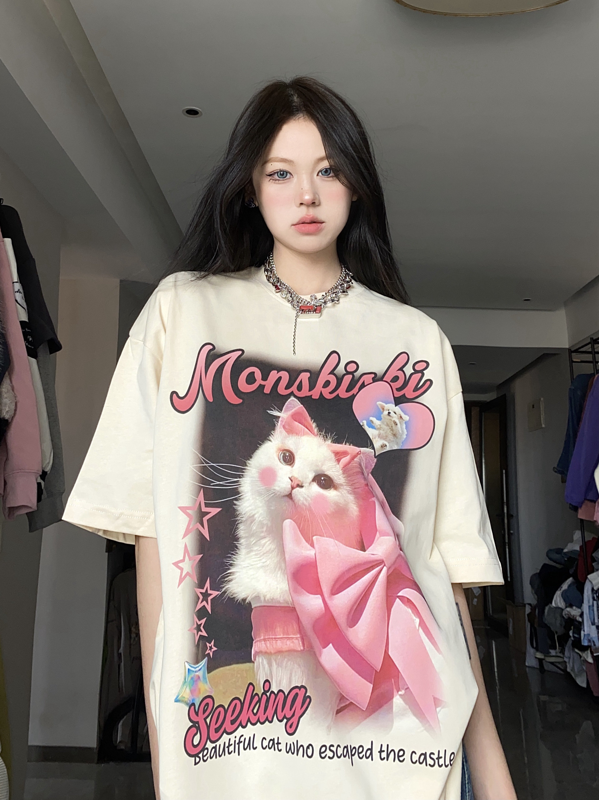 2025夏季新款猫咪韩版宽松休闲百搭圆领短袖T恤女学生上衣ins潮