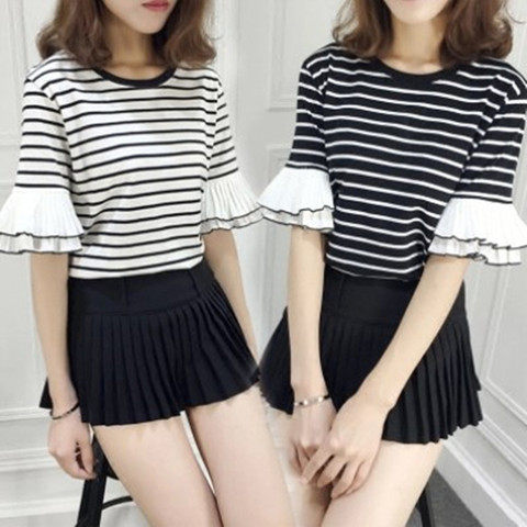 2025夏季新款韩版荷叶袖条纹休闲宽松短袖T恤女学生上衣ins潮