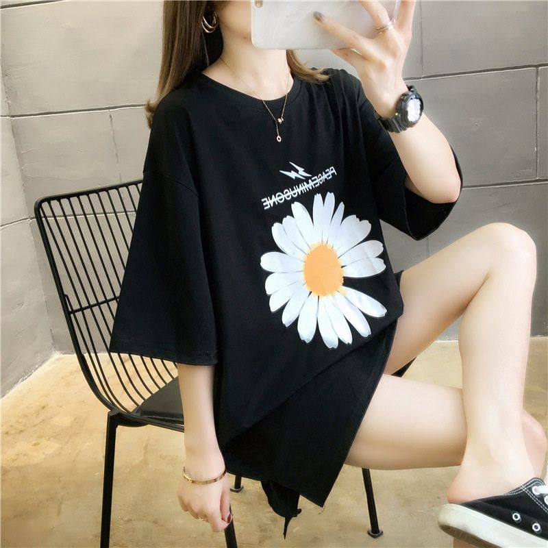 6535棉2022新款韩版夏季小雏菊宽松开叉中长款短袖T恤女学生上衣