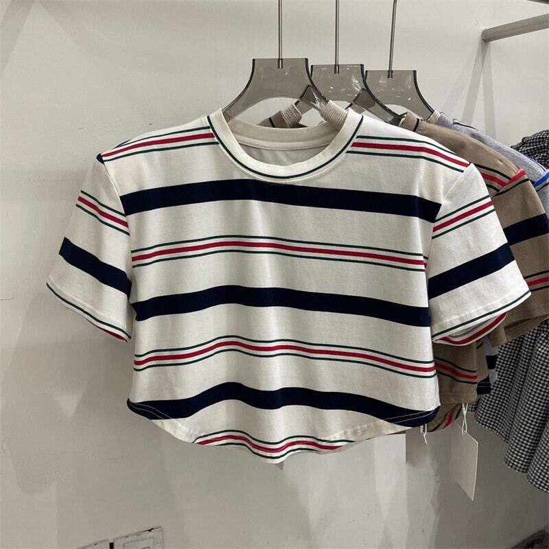 2024夏季新款设计感不规则圆领条纹短款高腰短袖T恤女学生上衣潮