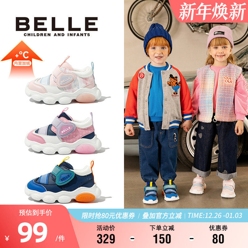 百丽童鞋女童运动鞋冬季加绒保暖毛毛虫鞋男童软底轻便宝宝休闲鞋