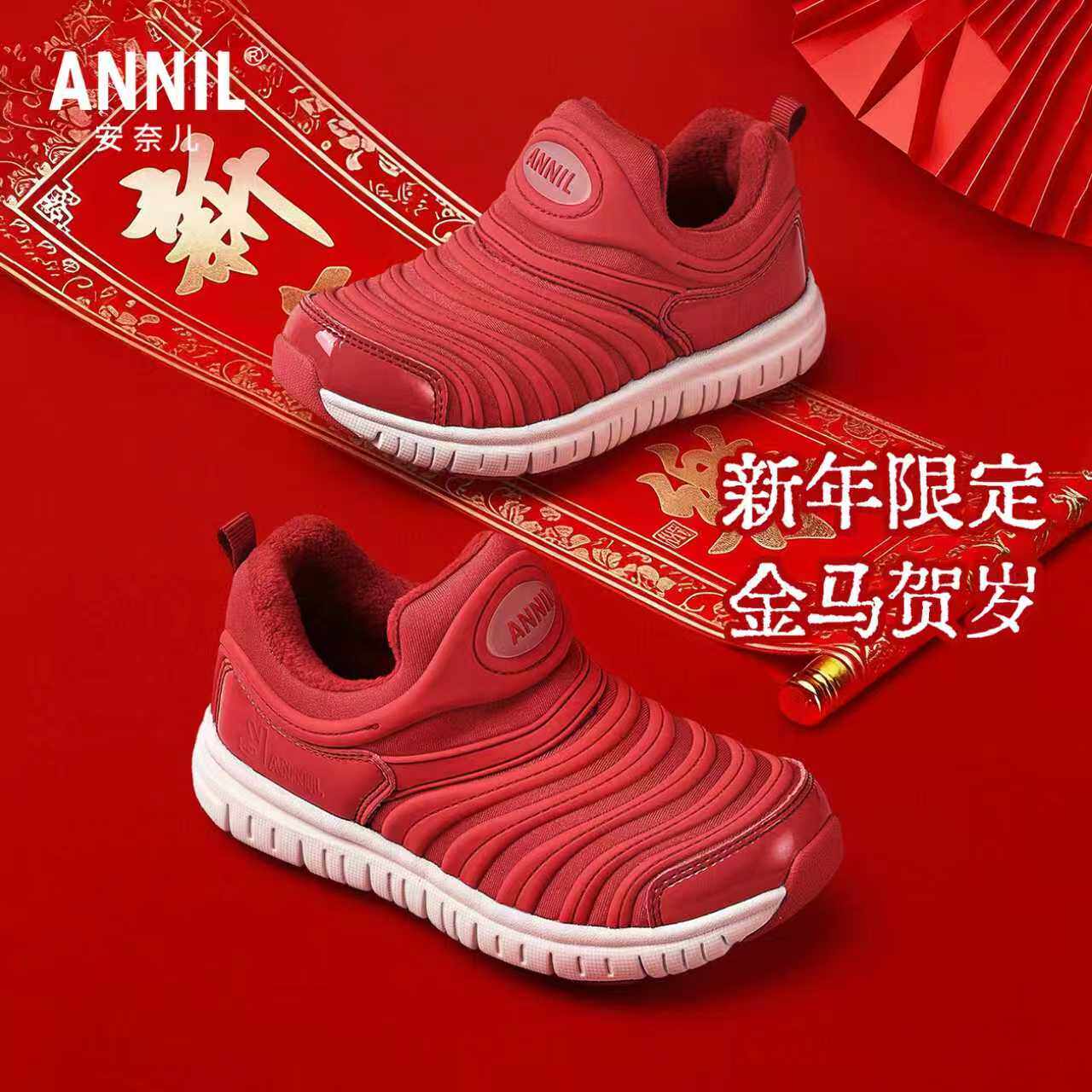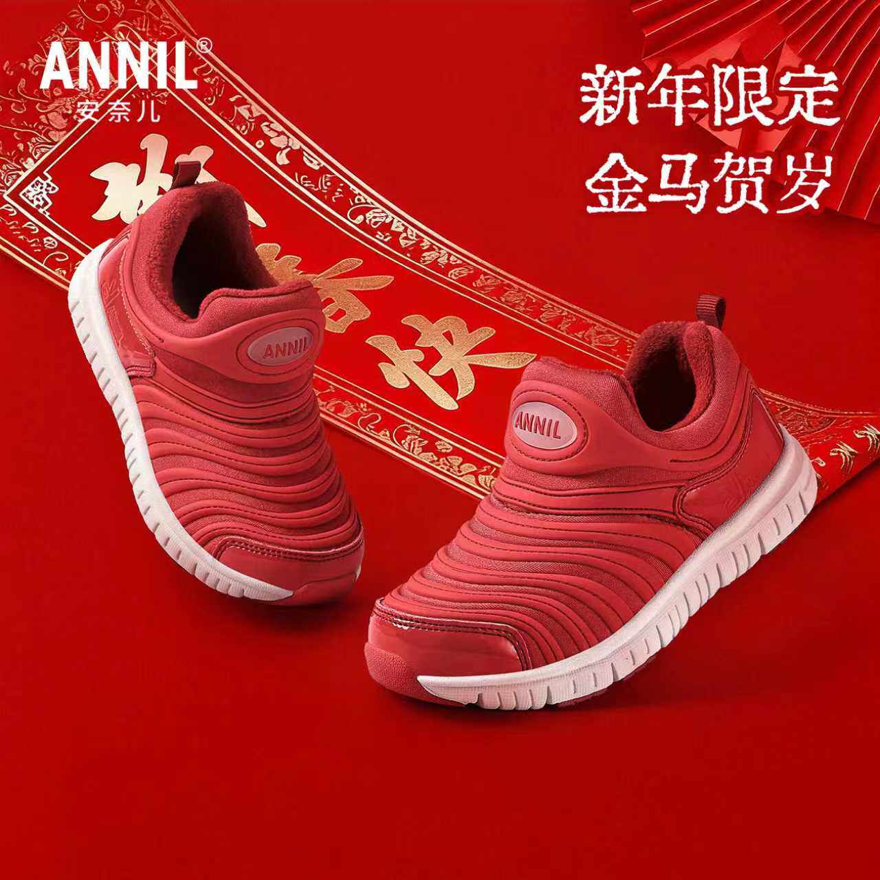 安奈儿儿童鞋子女童毛毛虫鞋2026新年款本命年男童红色加绒运动鞋